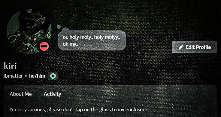 >> CURRENT MOOD : scratching at the glass to my enclosure..>> ABOUT ME : I <3 filth.>> PLEASE INTERACT : danocels, horror enjoyers, shared interests!